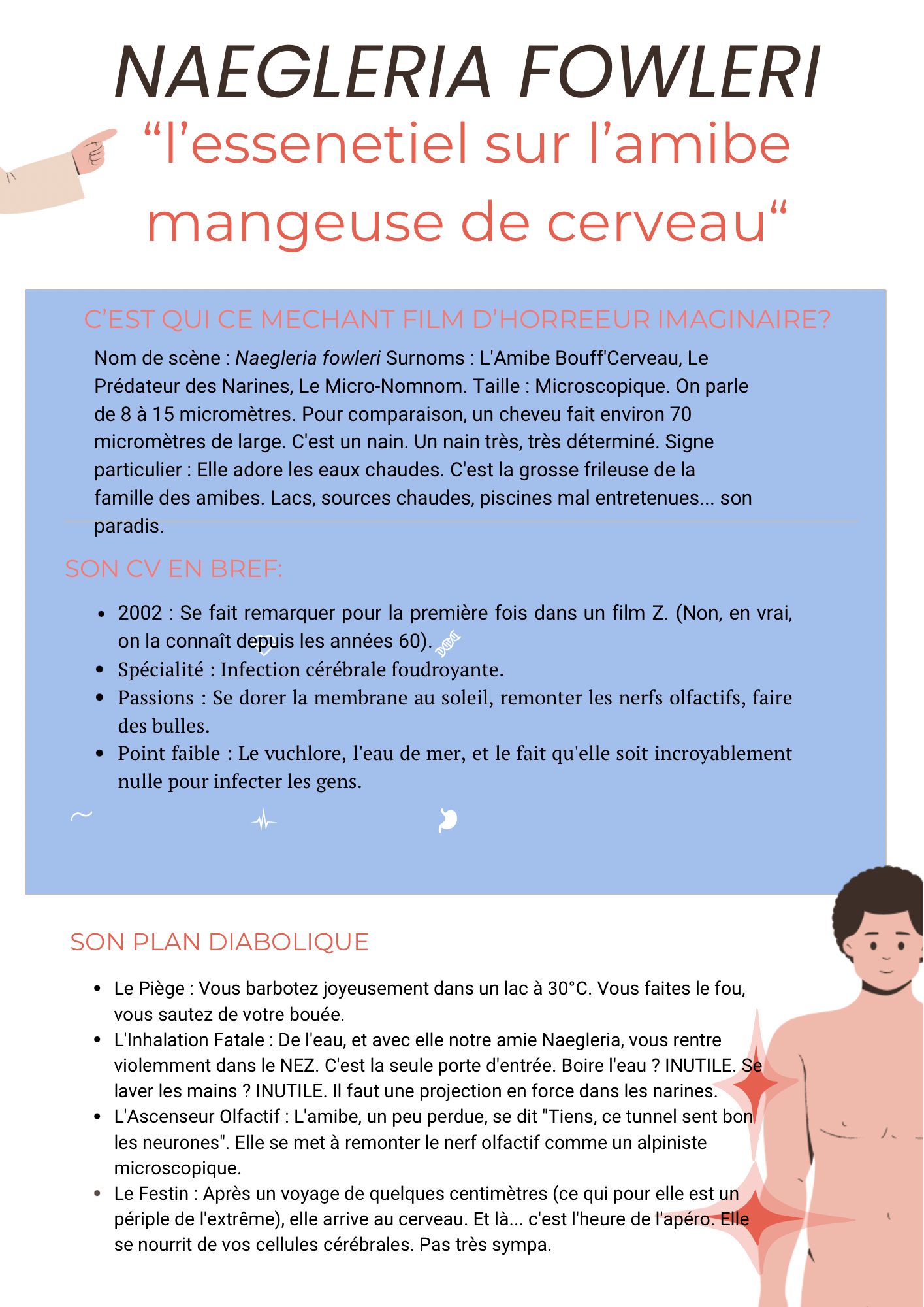 ⚠️ L’amibe ne cherche pas à vous manger spécifiquement – elle est juste opportuniste. Évitez de lui offrir votre nez en tapis rouge😂 !